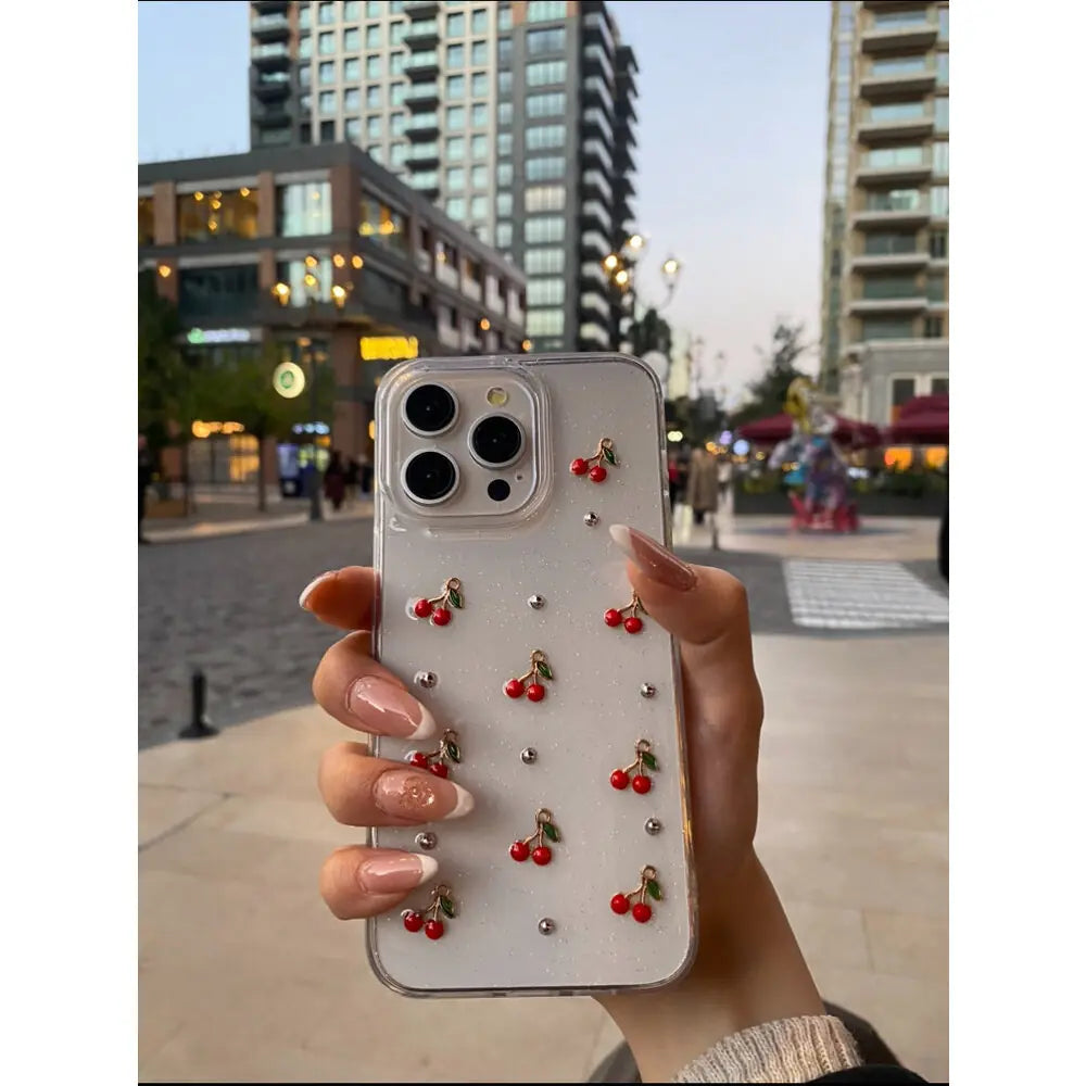 Kiraz Desenli Simli Şeffaf Kılıf